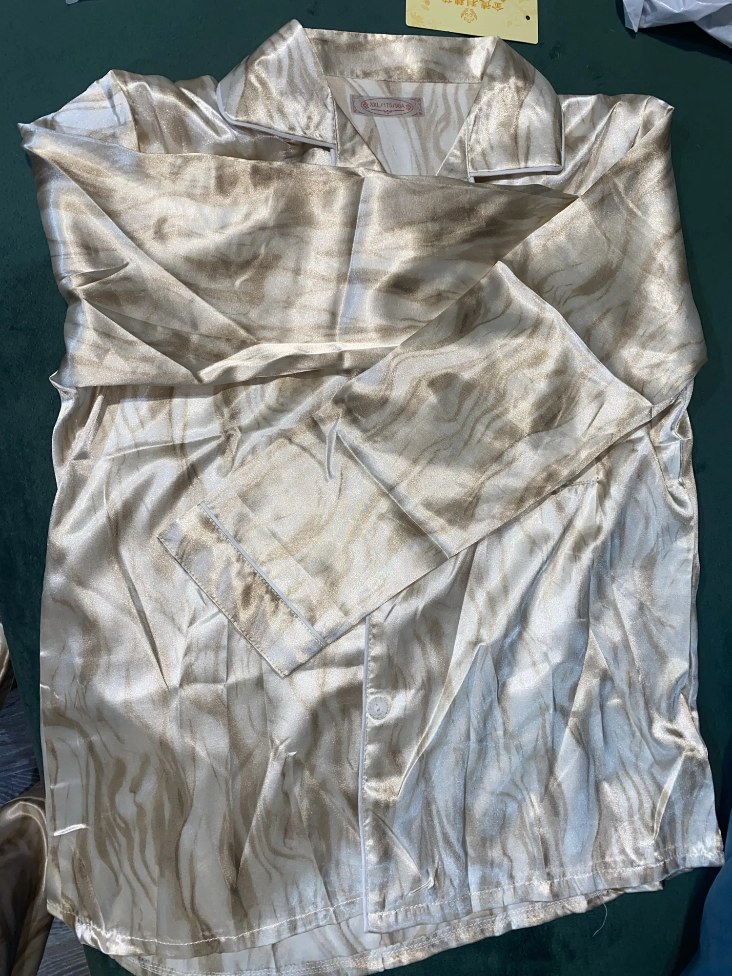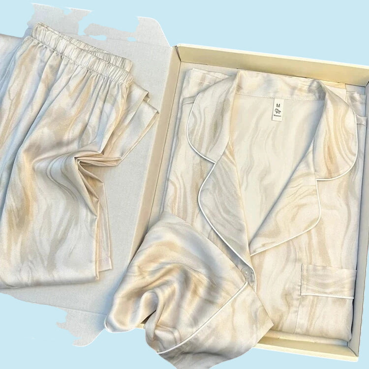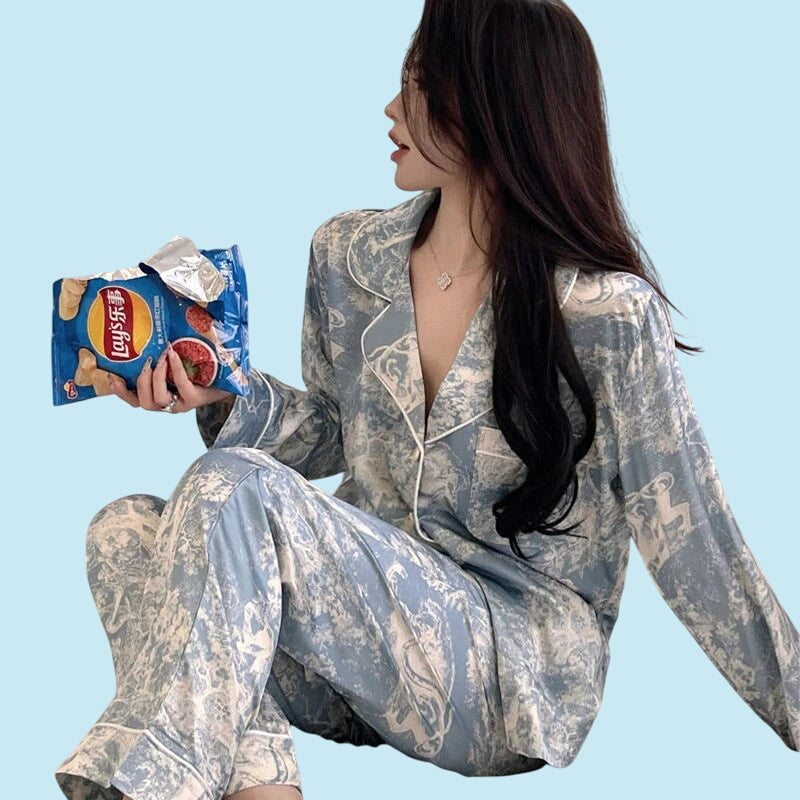 Crafted from a cool-touch satin blend, the fabric glides effortlessly over the body, catching the light with a soft, elegant sheen. The distinctive watercolor-inspired print evokes a sense of couture sophistication, transforming classic sleepwear into a wearable work of art.
