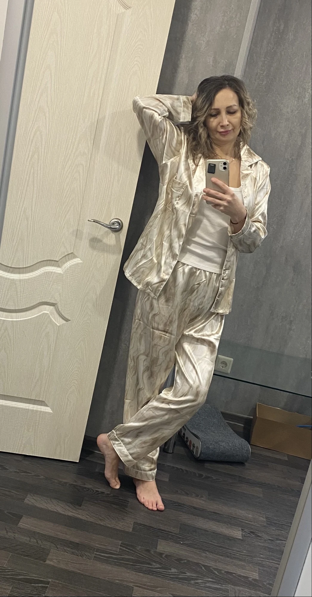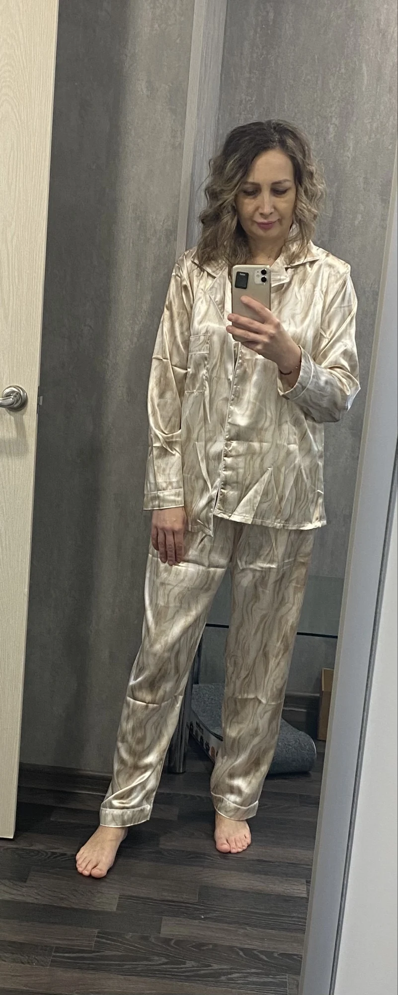 The long-sleeve top features refined tailoring with a graceful lapel collar and fluid drape. Coordinating ankle-length trousers complete the silhouette with a relaxed yet polished finish — perfect for the woman who cherishes beauty in every detail.