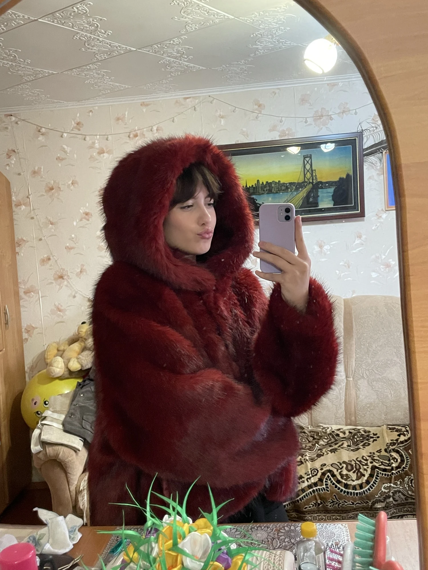 Whether styled for an evening in the city or a daytime winter stroll, its rich crimson tone captures attention with effortless grace. The cropped cut enhances your natural shape, while the plush texture adds depth, volume, and couture-level refinement.